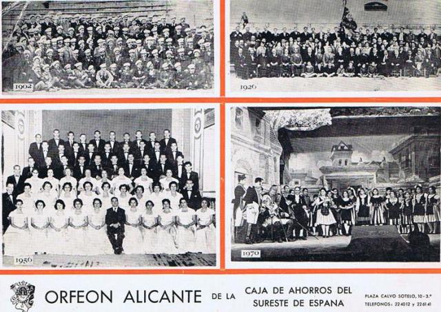 Hablar del Orfeón Alicante es hablar de la historia de la ciudad. Su recorrido comienza con su debut el 9 de Enero de 1902 en el Teatro Principal de Alicante bajo la batuta del maestro D. Vicente Poveda, con un coro de 124 voces, el sólo fue cantado por el tenor Gomis.